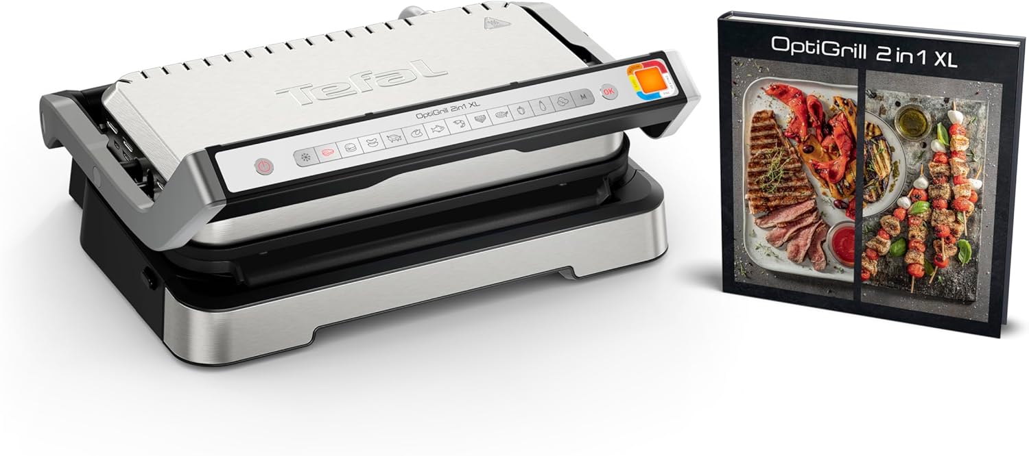 Tefal OptiGrill GC782D10 Barbecue de contact 2 en 1 XL, pliable, 12 programmes, affichage du niveau de cuisson, plaques XL amovibles, barbecue électrique, argenté